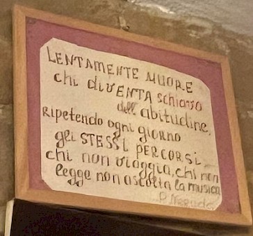 The translation: "Slowly dies he who becomes slave of habit, every day the steel path, he who does not travel, does not read, does not listen to music."